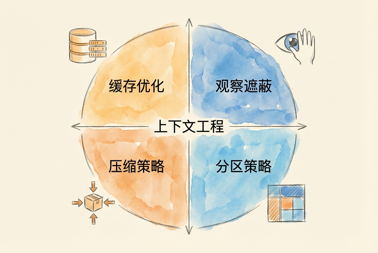 四策略框架:缓存优化(预防)→ 观察遮蔽(早期干预)→ 压缩策略(主动管理)→ 分区策略(架构解决),形成层层防御。
