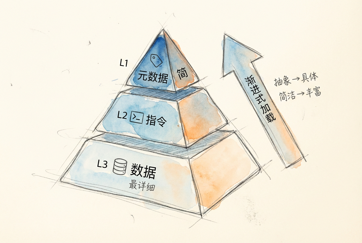 三层信息架构:L1(元数据,始终加载)→ L2(指令,按需加载)→ L3(数据,即时加载),可节省 87% token 消耗。