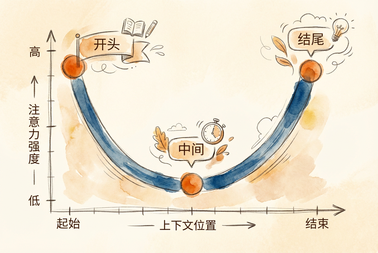 研究发现,Transformer 模型的注意力分布呈 U 型曲线:开头和结尾的信息召回率最高,中间区域下降 10-40%。这意味着关键信息应放在系统提示(开头)和当前任务描述(结尾),而非中间位置。