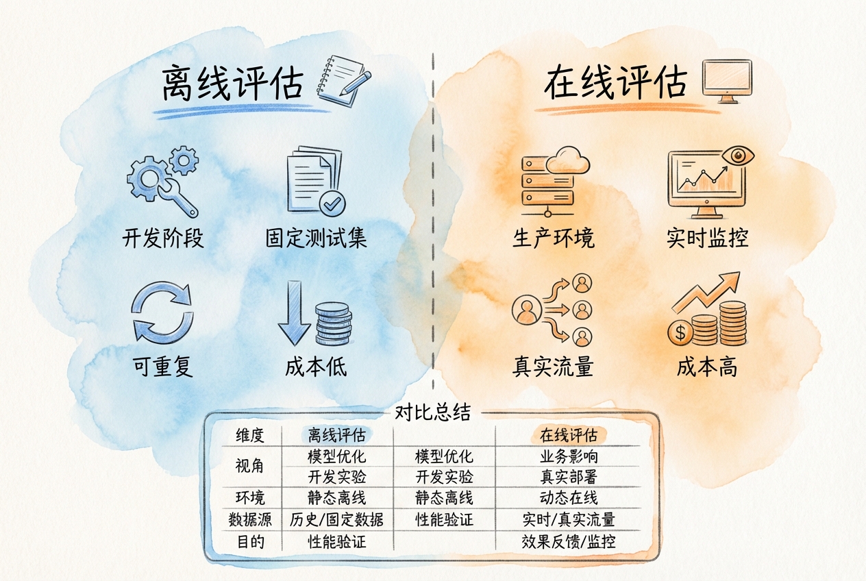 评估贯穿全流程:从原型到生产,持续评估驱动迭代。离线评估作为质量门禁,在线评估作为持续优化手段。