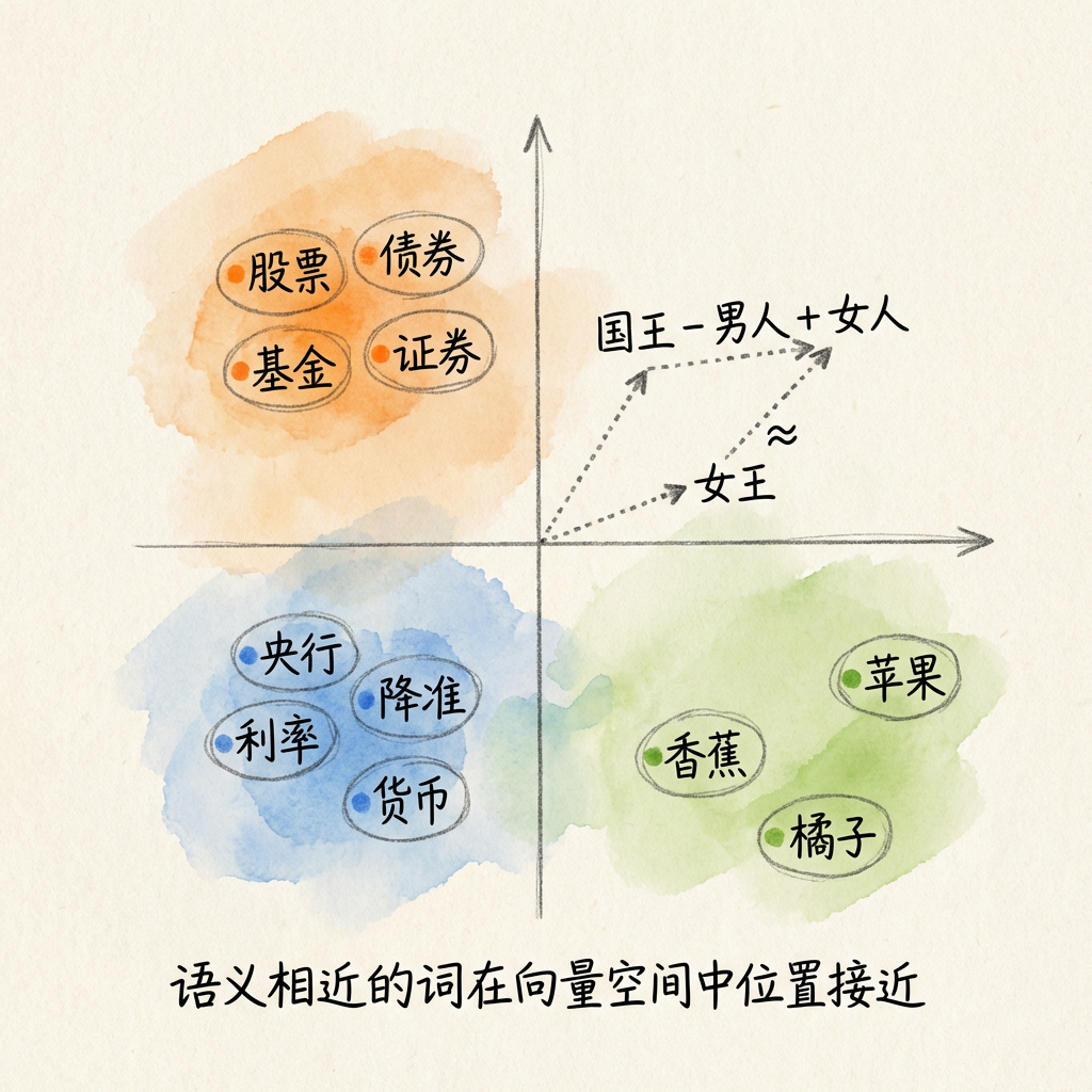 传统信息检索主要依赖词频统计方法。经典的 TF-IDF(词频-逆文档频率)和 BM25 算法通过统计词语在文档中出现的频率来衡量相关性。这类方法的优点是计算高效、可解释性强,缺点是无法理解语义——「降低存款准备金率」和「降准」在词汇层面毫无关联,但它们表达的是同一概念。